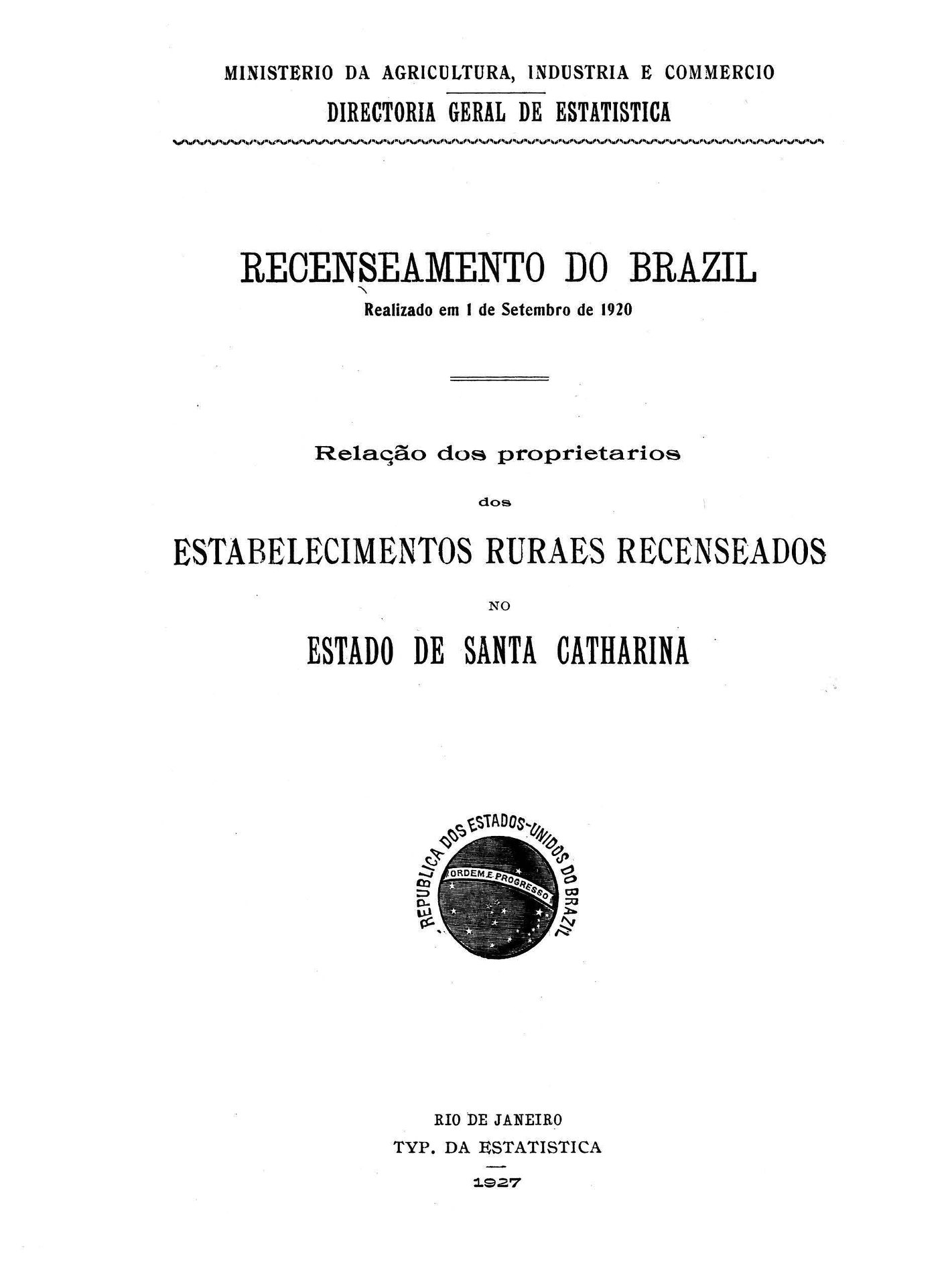 Relação dos proprietarios dos estabelecimentos ruraes recenseados no Estado de Santa Catharina / Ministerio da Agricultura, Industria e Commercio, Directoria Geral de Estatistica.